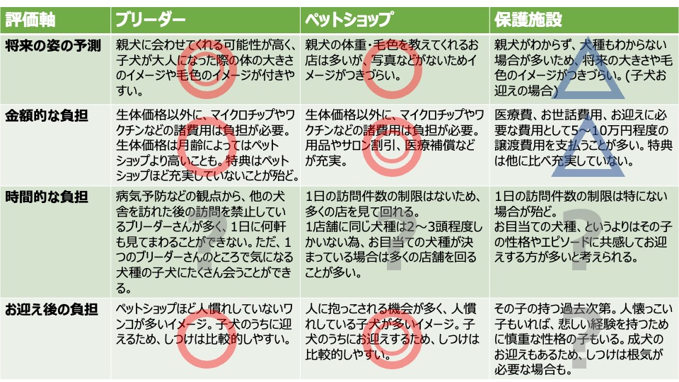 - 運命の相手であるワンコに出会うためにどれくらいの時間がかかるかを比較します。1日に何軒も見て回りたいという精力的なタイプの方と、時間がかかってもじっくりと探したい、という方、嗜好は様々なため○・△はつけづらく、特徴のみ比較しています。