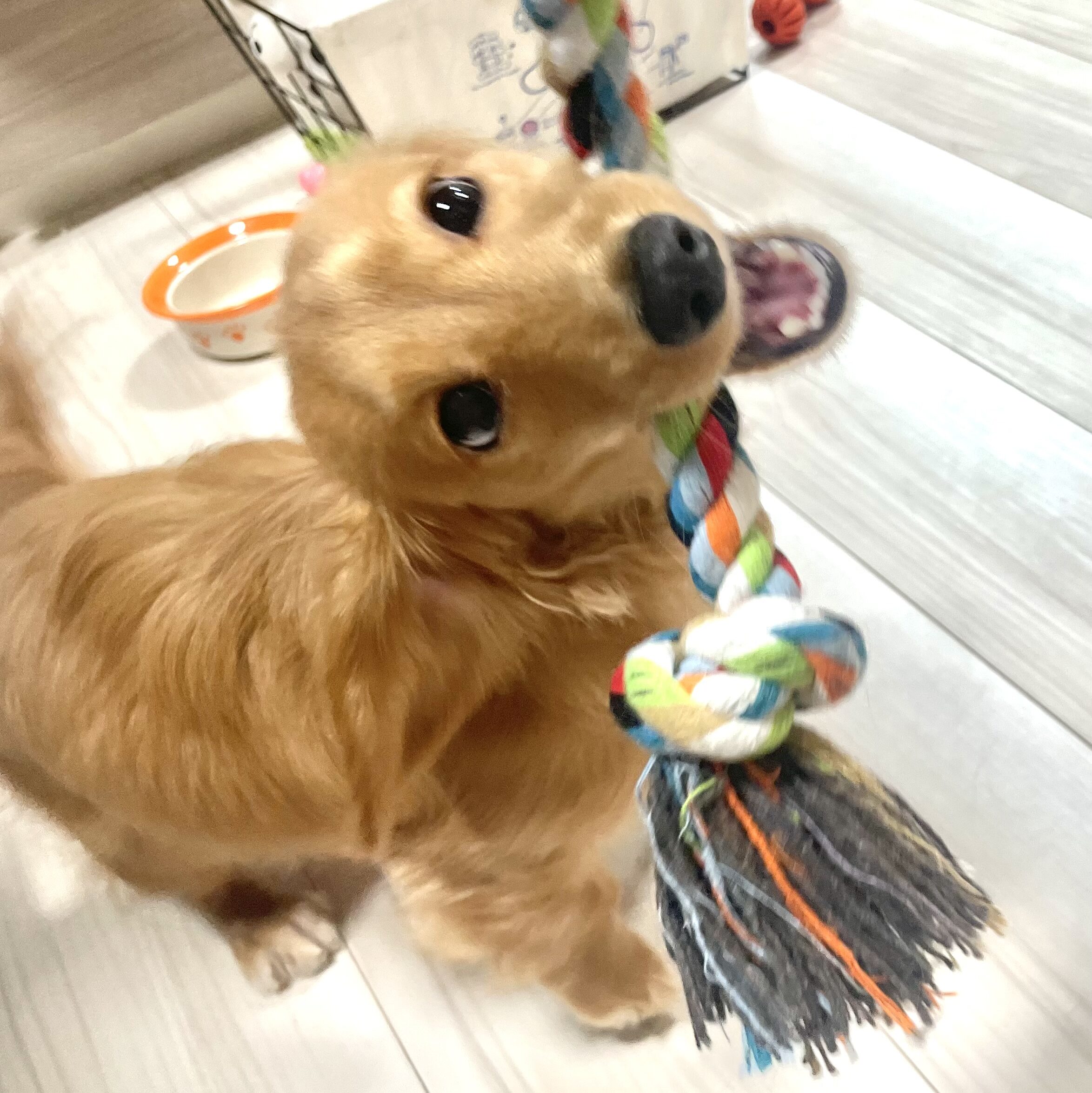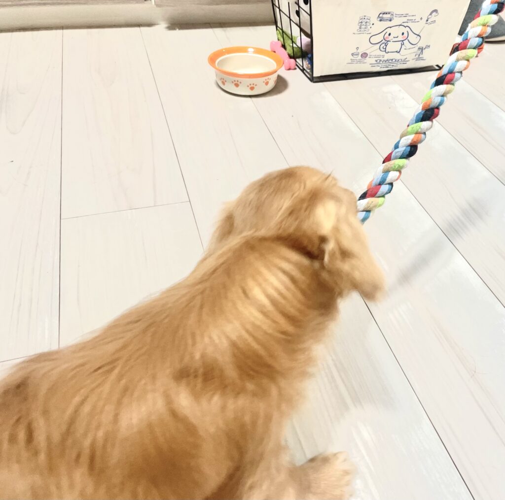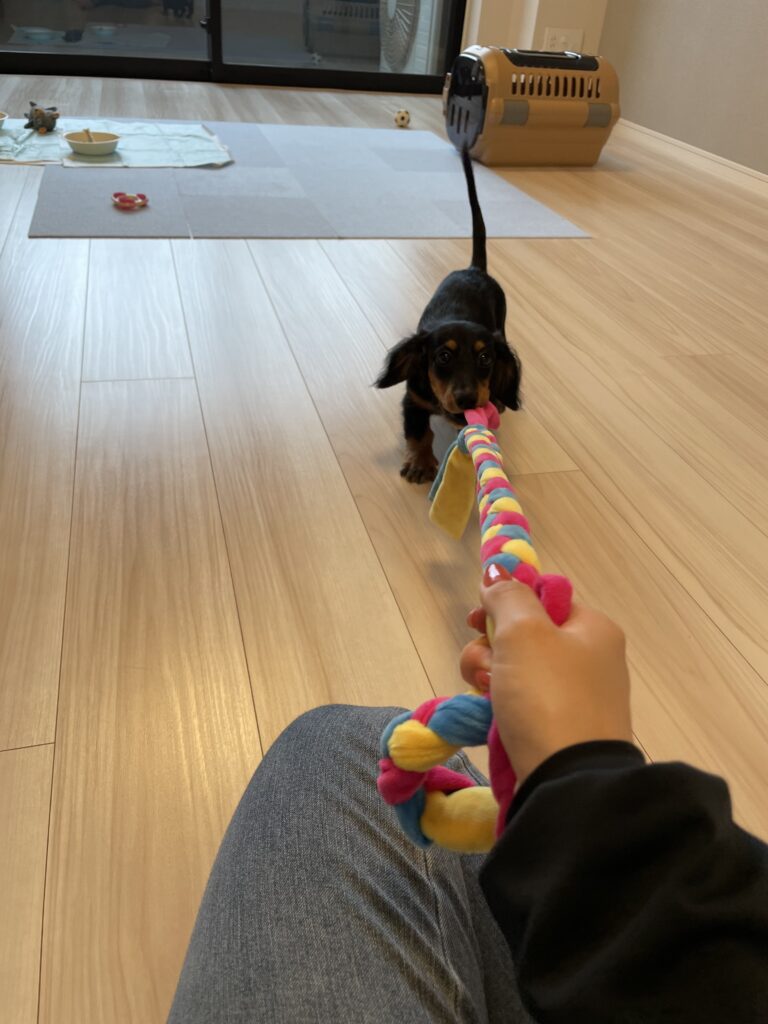 パピーちゃんの時はサークルに括って一人遊びしてもらったり、引っ張りっこをして遊んでいました。