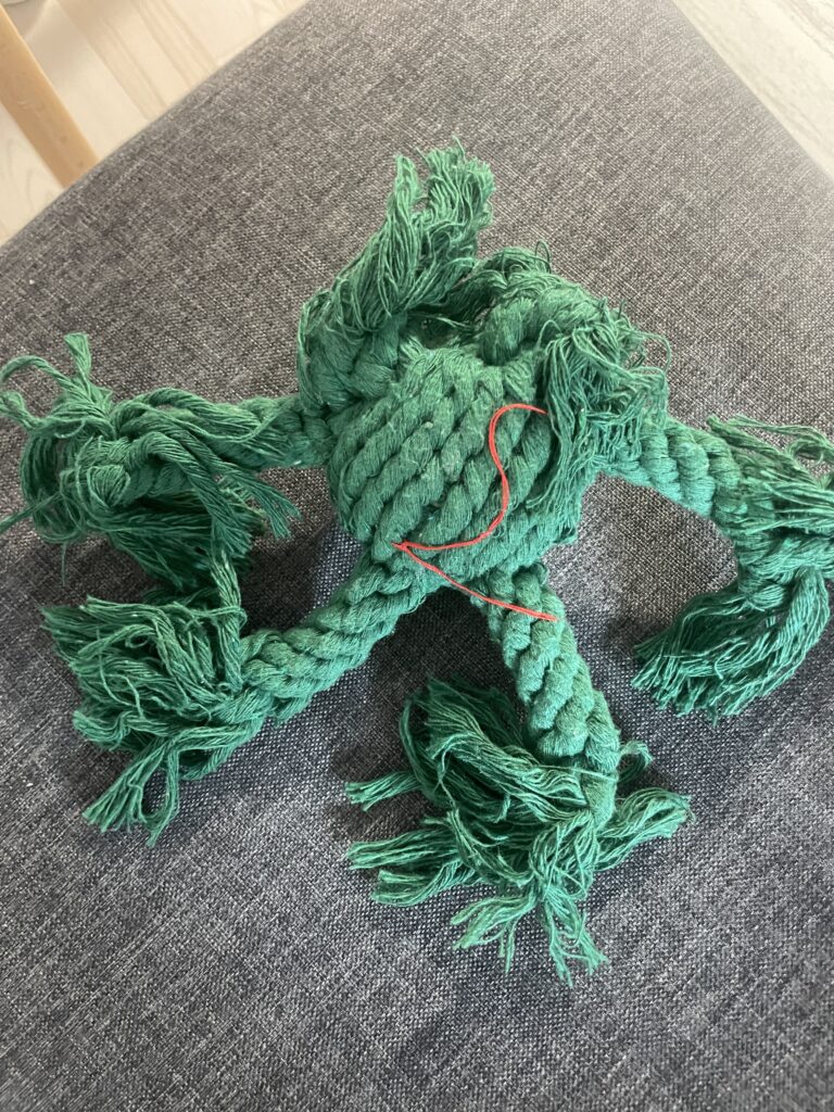 このような短めのロープトイは鳴き笛(噛むとピーっとなるやつです!)が入っている場合が多いです。