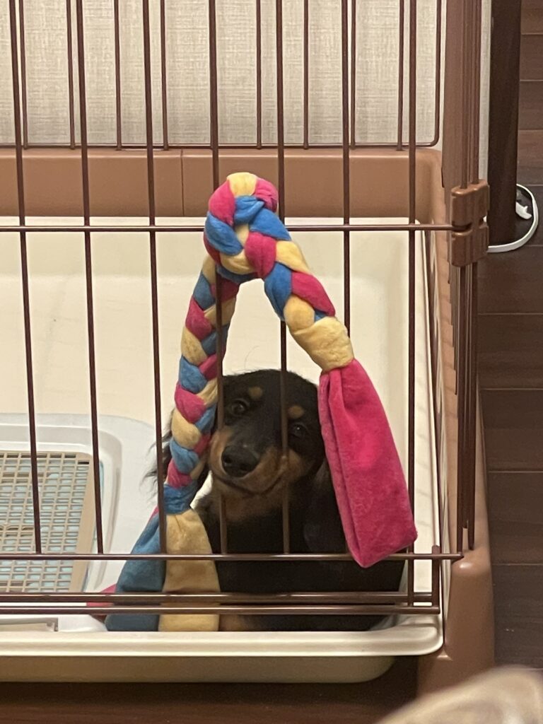 ワンコのサークルに長いロープトイを括りつけると、一人で引っ張りっこ遊びをしてくれます。